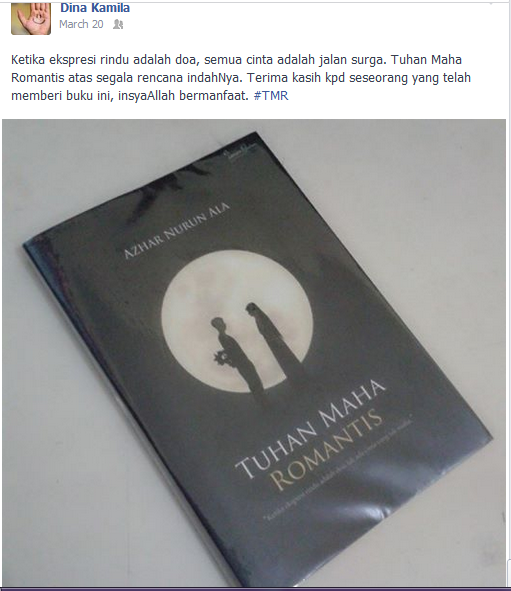 "Terima kasih kepada seseorang yang telah memberi buku ini, InsyaAllah bermanfaat." Saya mendapat buku ini dari salah seorang teman saya. Awalnya saya ingin sekali membeli buku ini ketika launching, tapi karena keuangan lagi limit, akhirnya saya menahan keinginan untuk membeli, hehe. Eh ternyata teman saya pengertian sekali, memberi buku ini. Ah bahagia sekali rasanya. Dia tahu bahwa Azhar Nurun Ala adalah penulis favorit saya. Penulis muda pendatang baru ini, memberi banyak inspirasi kepada saya. Buku ini sudah banyak sekali yang mengantri, Insya Allah bermanfaat. Terima kasih kepada teman saya yang sudah memberi buku ini.